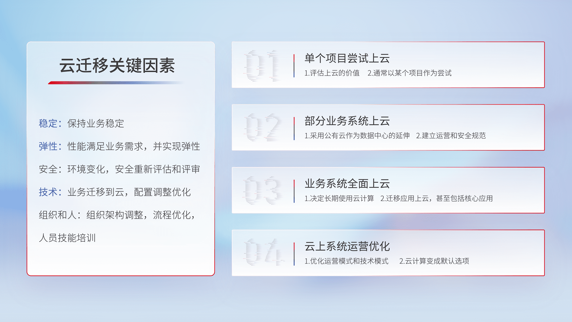 结合实际业务,,从规划设计、、云平台选型、、云原生改造、、、、数据迁移、、、、集成交付,,迁移全过程为客户识别最佳上云路径,,,,做好风险识别管理,,,,设计网络架构、、身份权限、、、安全审计合规、、、、操作审计、、、、日志审计、、、、监控告警策略、、多站点容灾设计等,,对云上基础设施进行整体规划,,提升IT治理水平,,以满足弹性、、高可用、、高性能的需求。。