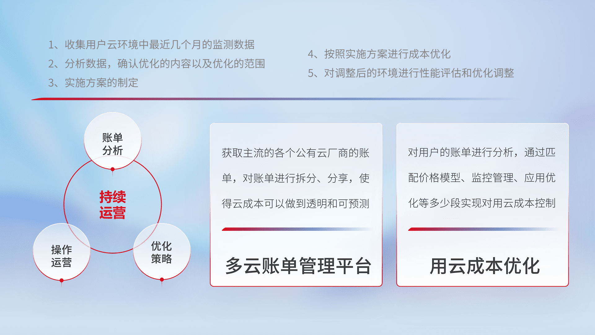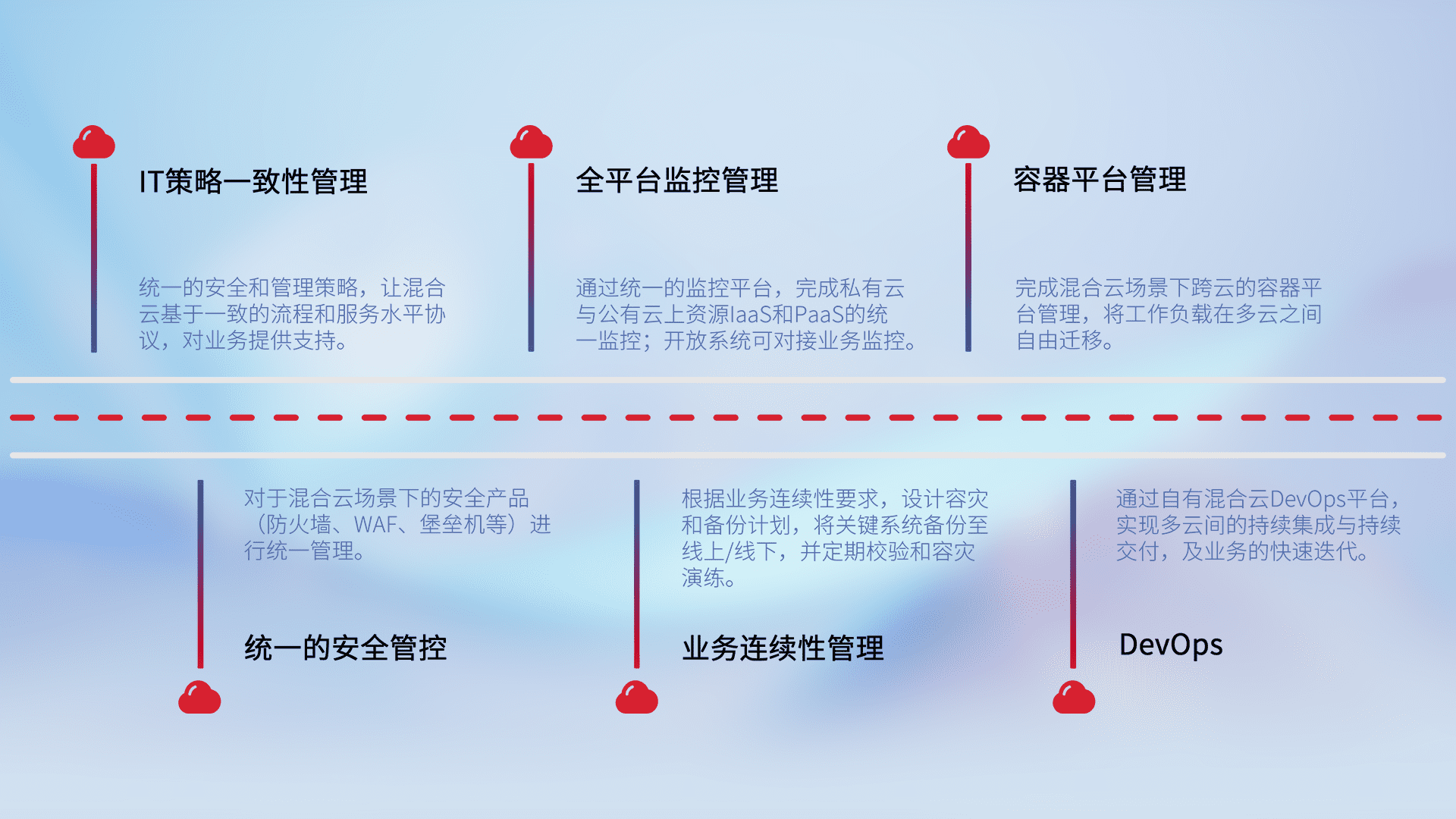 通过多云纳管,,,以统一的资源数据模型把客户的云资源进行抽象和封装,,,进而实现对多云资源的统一操作,,,保障云资源管理的可靠性、、、、稳定性与可用性。。。量身定制化运维内容,,,,配置、、、、开发运维、、补丁管理、、、、备份、、、、监控、、、、认证和访问管理、、、、审计和日常巡检等,,保障在用云过程中的可靠度,,,稳定度以及高可用率。。